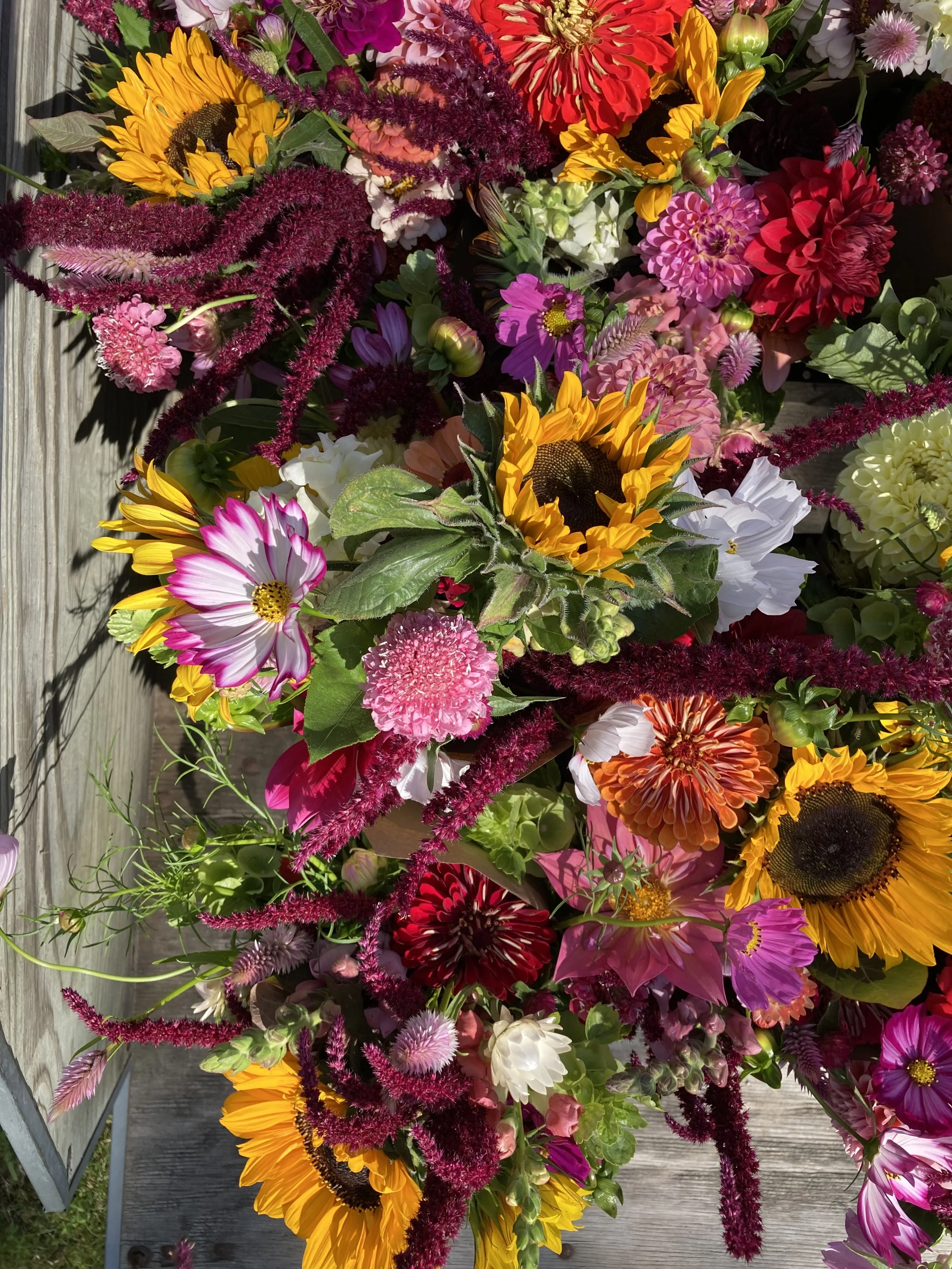 Monday-Sunday: You will find our ‘flower bar’ open for single stem flower and bunched flower purchases. This year that will include the following varieties: zinnias, sunflowers, dahlias, snapdragons, strawflowers, eucalyptus, statice, gomphrena, amaranth, celosia and mint.